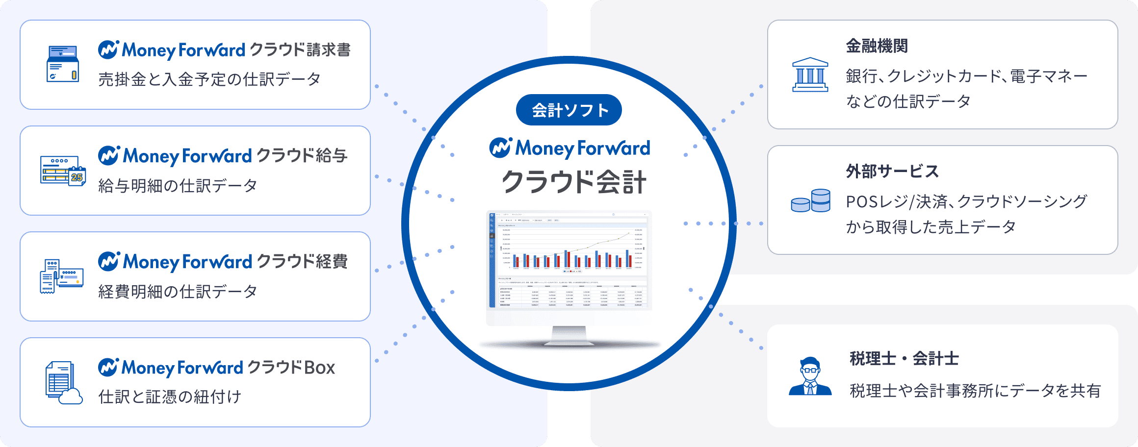 マネーフォワード クラウド会計は、他のマネーフォワード クラウドのサービスや外部のサービスと連携することで、