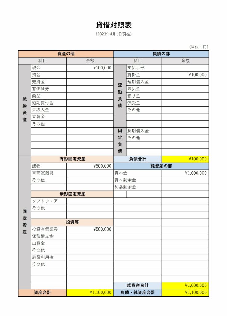 貸借対照表の左側の合計額と右側の合計額は常に一致する関係にあります。簡単な例を見ていきましょう。