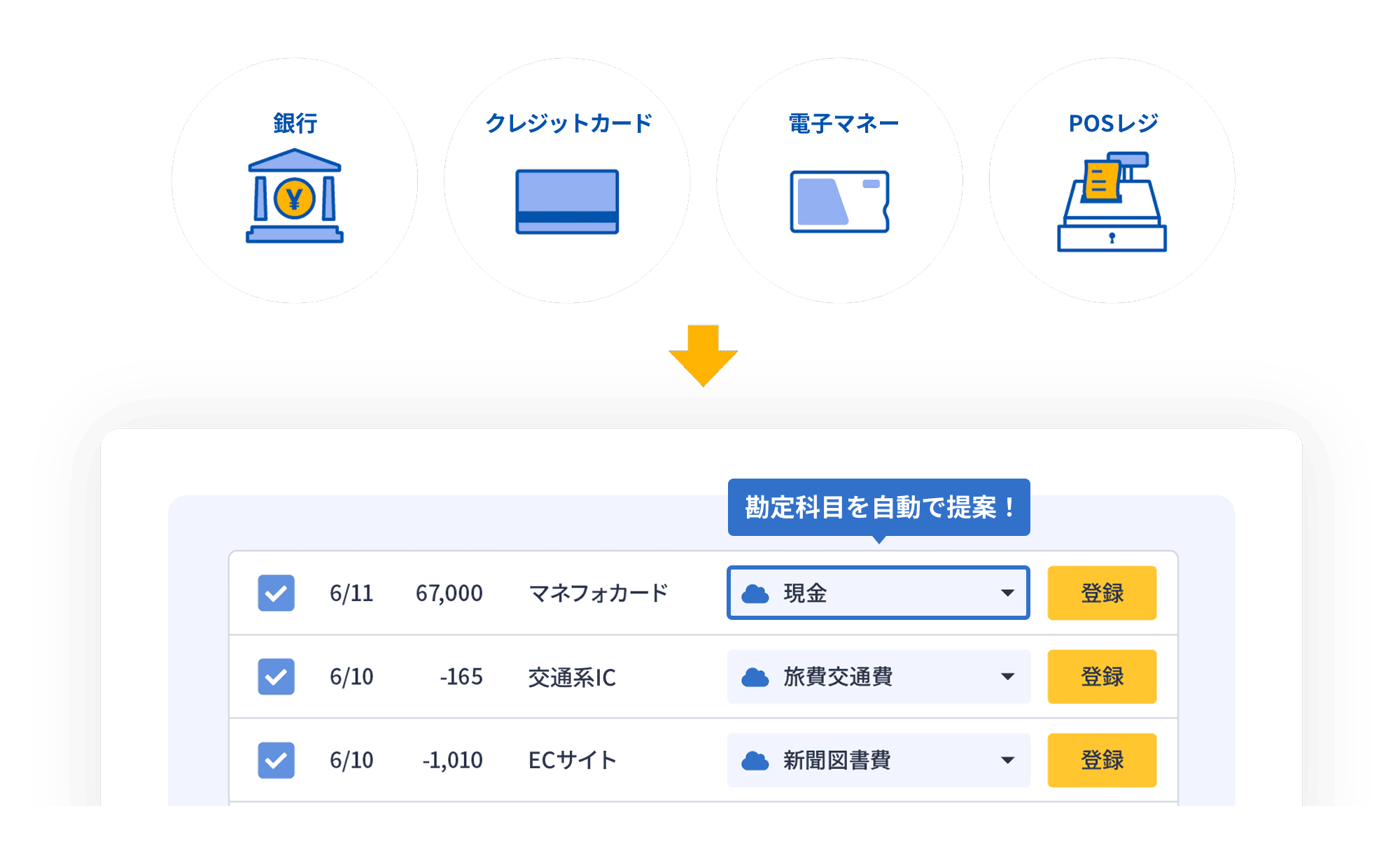 毎日の入出金を自動取得、AIが勘定科目を提案