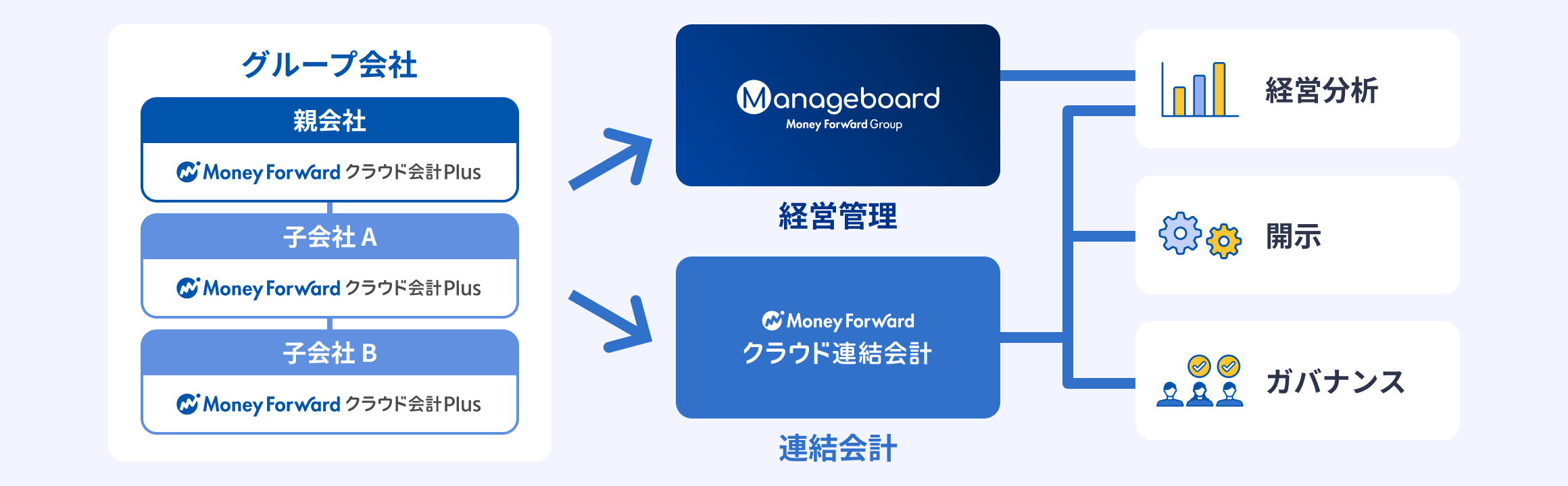 グループ各社で利用することで、データが経営管理や連結会計へシームレスに連携され、高度な経営分析や開示・監査へのスムーズな対応が可能になります。