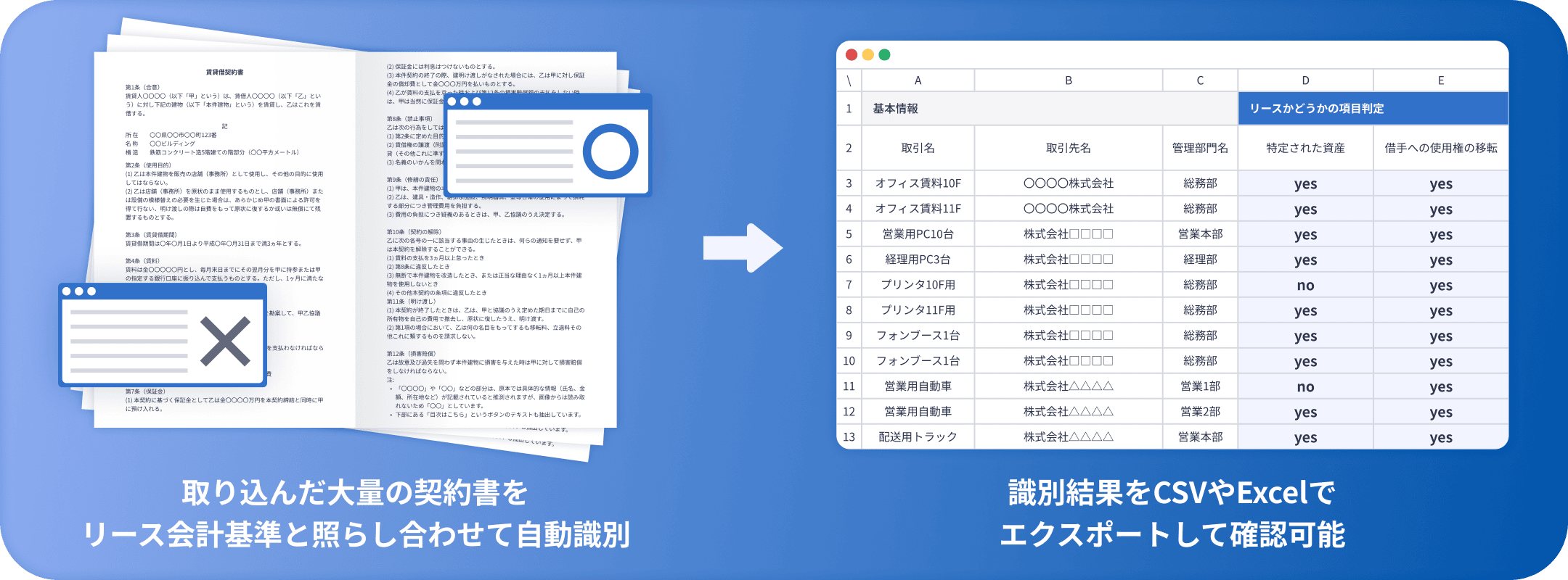 契約書をAIがリース契約かどうか自動識別。自動識別結果を『マネーフォワード クラウドリース会計』に連携可能です。