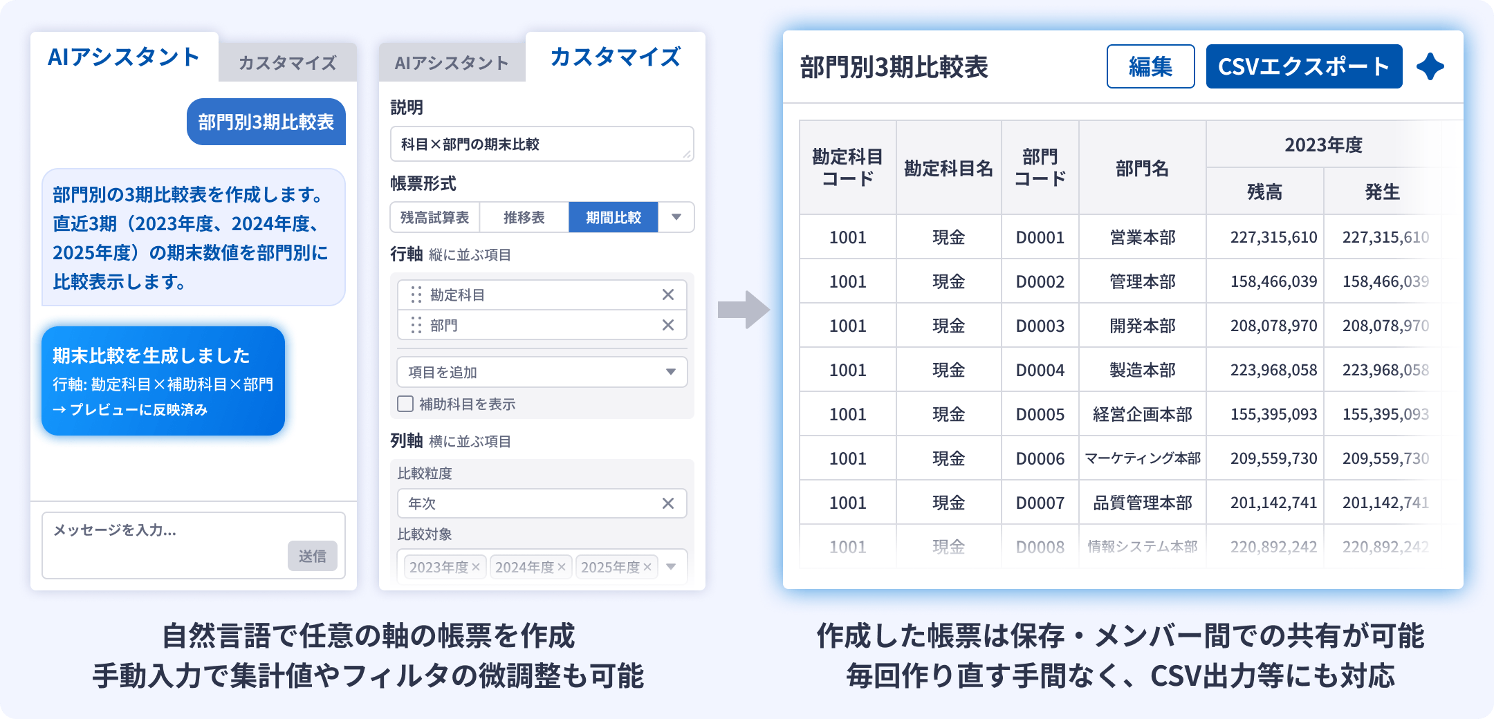 複雑な条件設定なく、自然言語(チャット)で欲しい帳票を即時生成。帳票は保存・共有ができ、気になる数値は仕訳のドリルダウンが可能です。