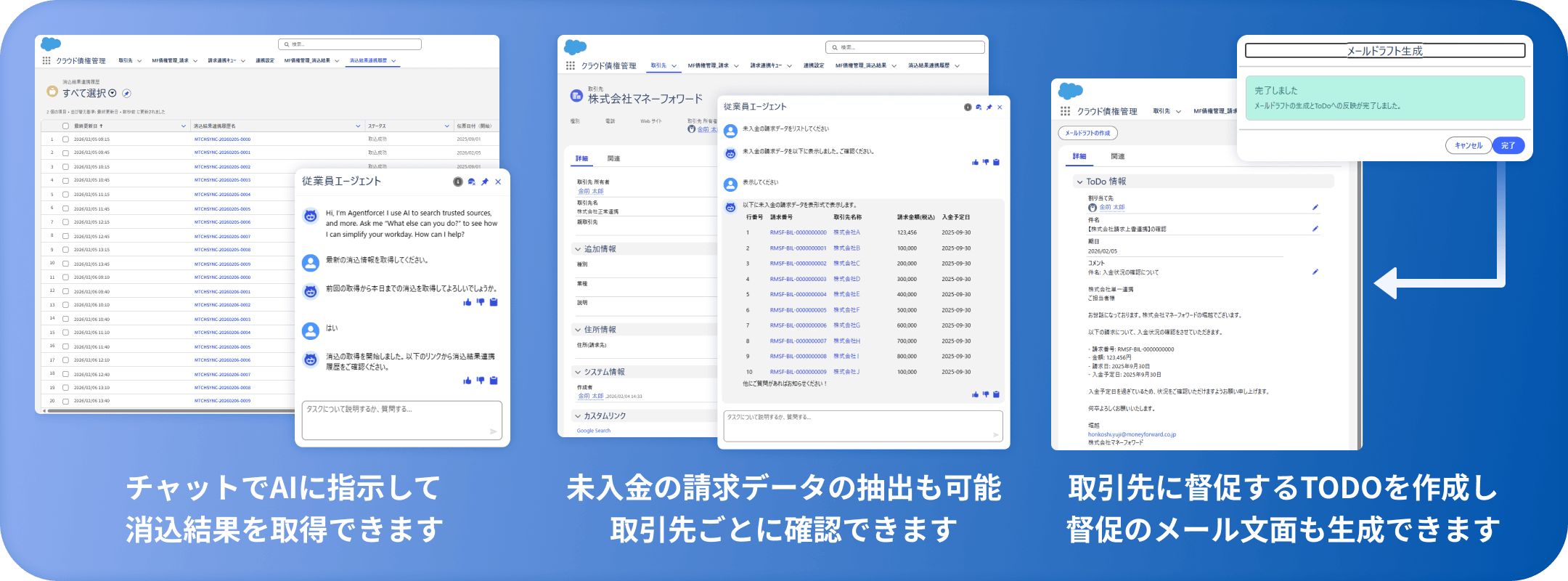 Salesforce Agentforceを基盤に、入金消込状況の把握から未入金の連絡タスク発行、顧客への連絡メール文面の作成までエージェントが支援します。