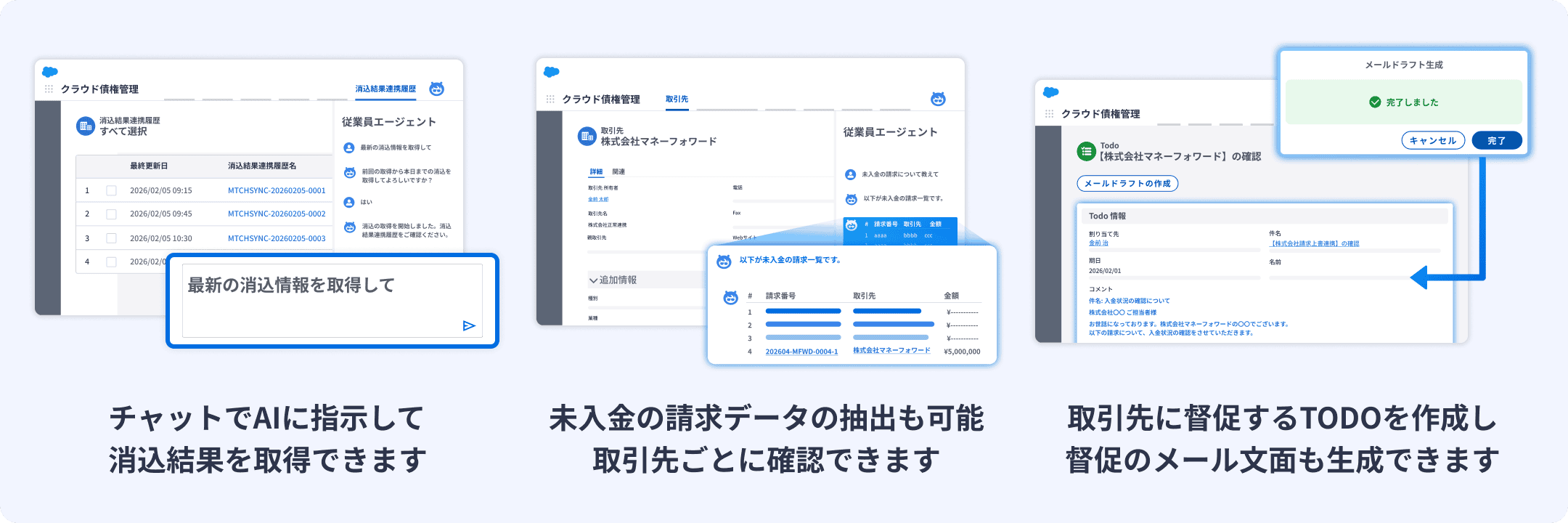 Salesforce Agentforceを基盤に、入金消込状況の把握から未入金の連絡タスク発行、顧客への連絡メール文面の作成までエージェントが支援します。