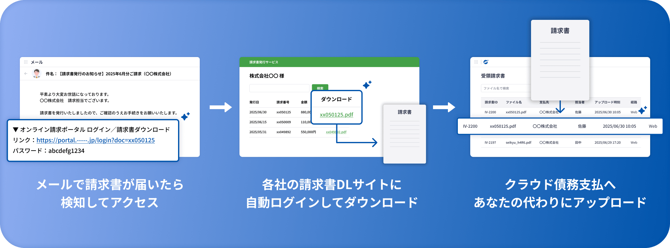 請求書受領メールを検知すると、AIがリンクやパスワードを検出し、各社の請求書DLサイトを自律的に操作し、請求書の取り込みから支払依頼作成までを代行します。これにより、請求書の受領、ダウンロード、支払依頼登録といった業務フローが自動化され、毎月の煩雑な作業から解放されます。