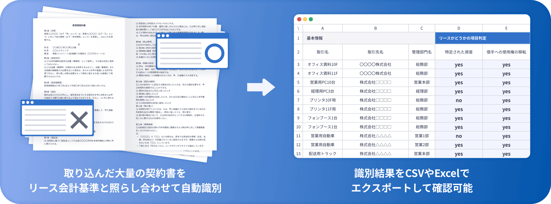難解な新基準の定義(資産の特定、使用の指図権など)に沿って、契約書ごとにリース該当・非該当を識別します。