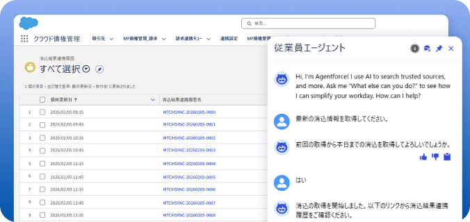 Salesforce Agentforceを基盤に、入金消込状況の把握から未入金の連絡タスク発行、顧客への連絡メール文面の作成までエージェントが支援します。
