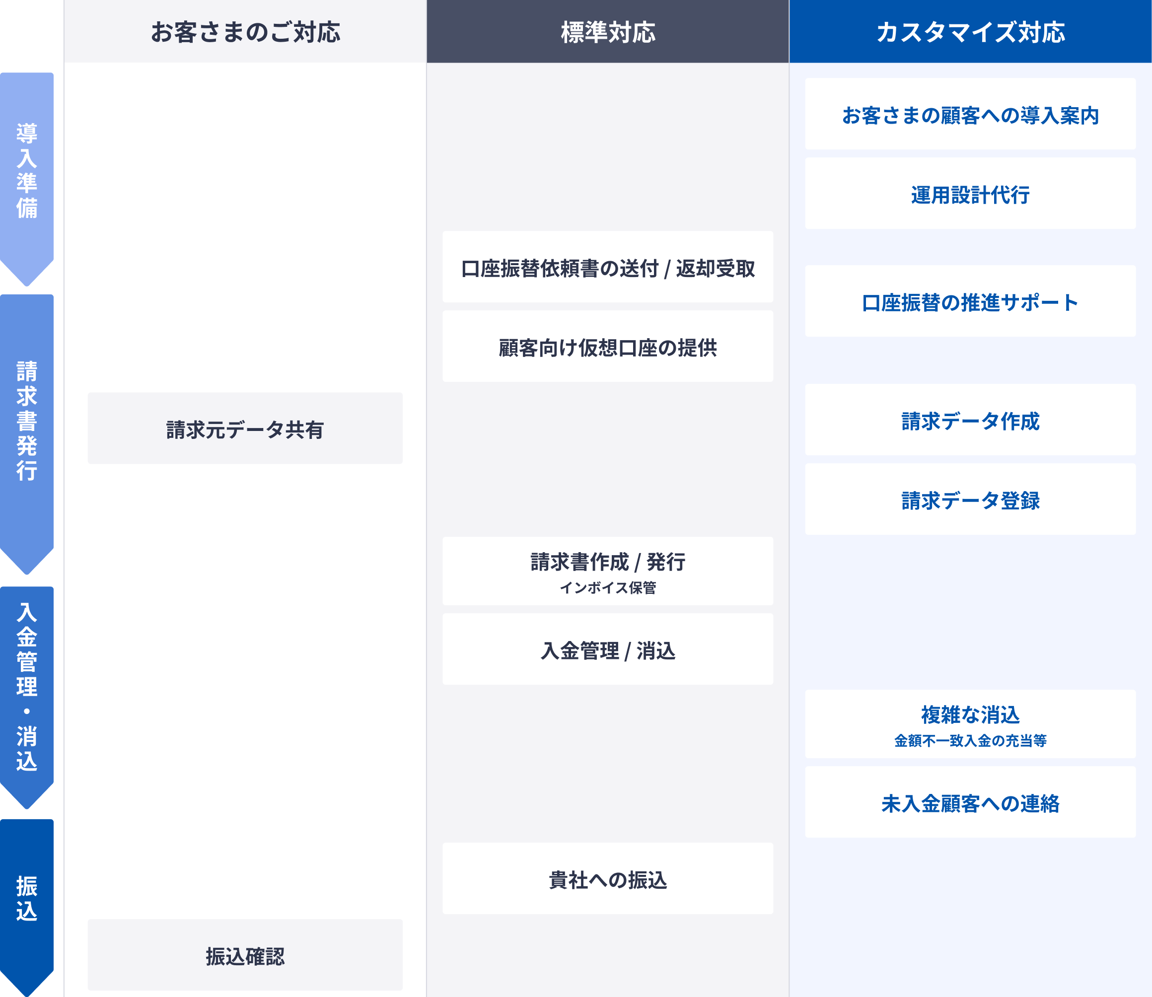 お客さまの業務プロセスにあわせてカスタマイズし、請求業務全般をサポートします。