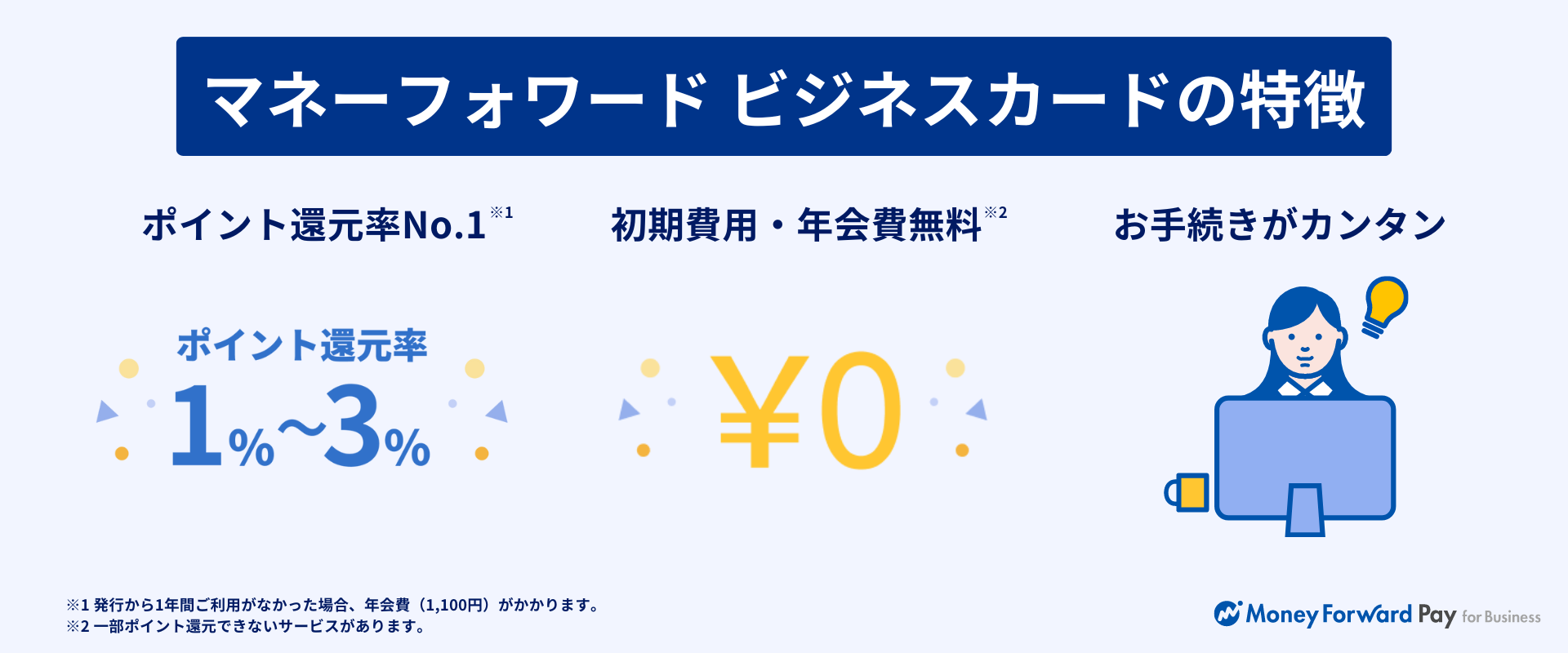 マネーフォワード ビジネスカードは、初期費用・年会費無料(※)で発行できるビジネスカードです。個人事業主の方なら本人確認のみですぐにご利用いただけます。