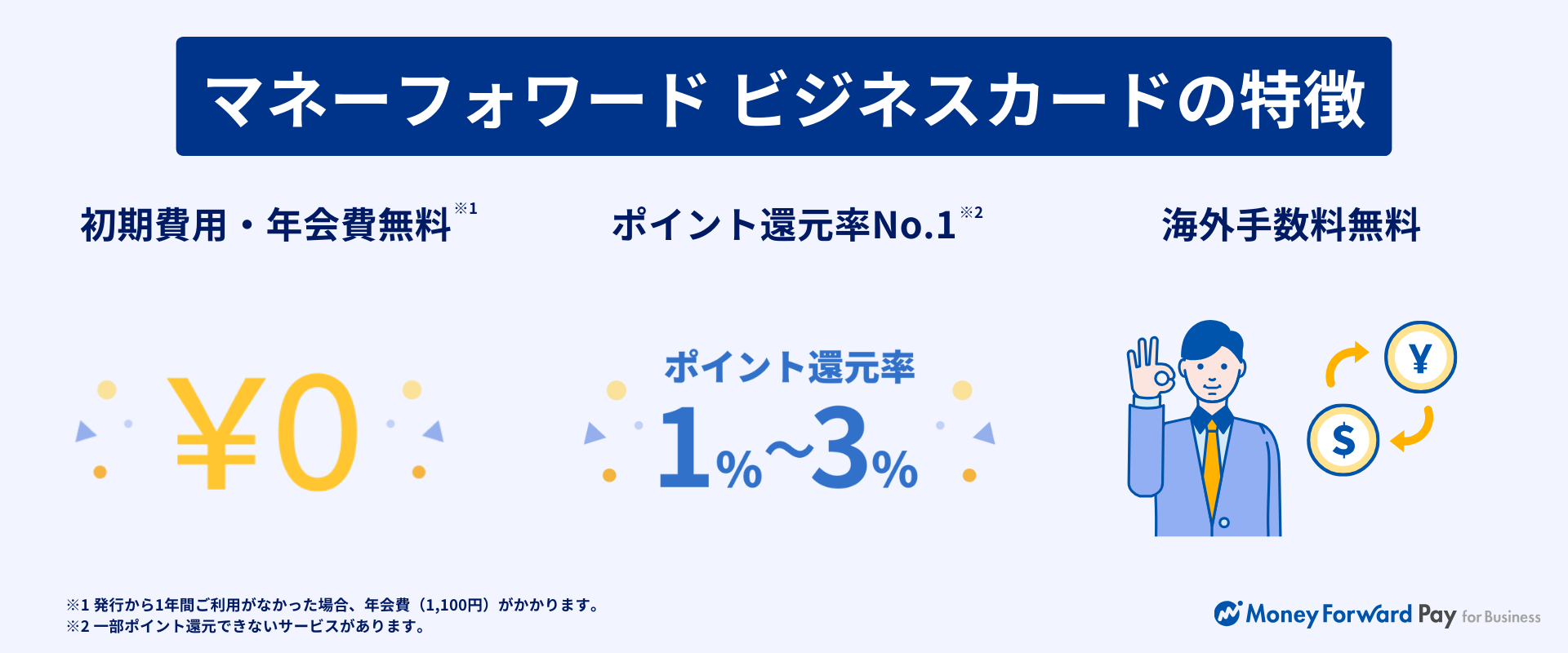 マネーフォワード ビジネスカードは、初期費用・年会費無料(※)で発行できる法人向けクレジットカードです。決算書の提出不要で、新設法人や個人事業主でもご利用いただけます。
