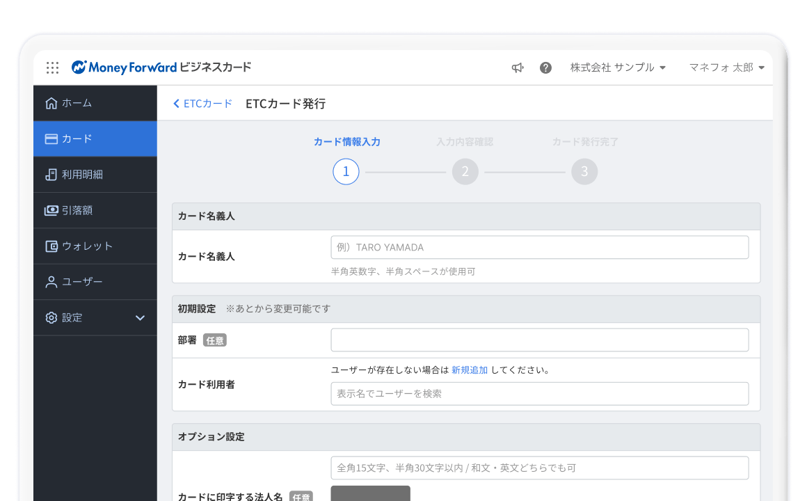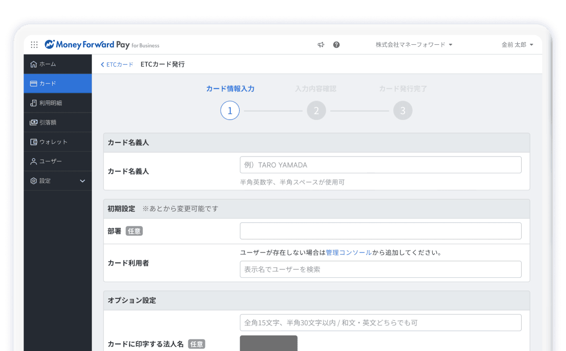 マネーフォワード ビジネスカードの管理画面からETCカード発行を申請します。