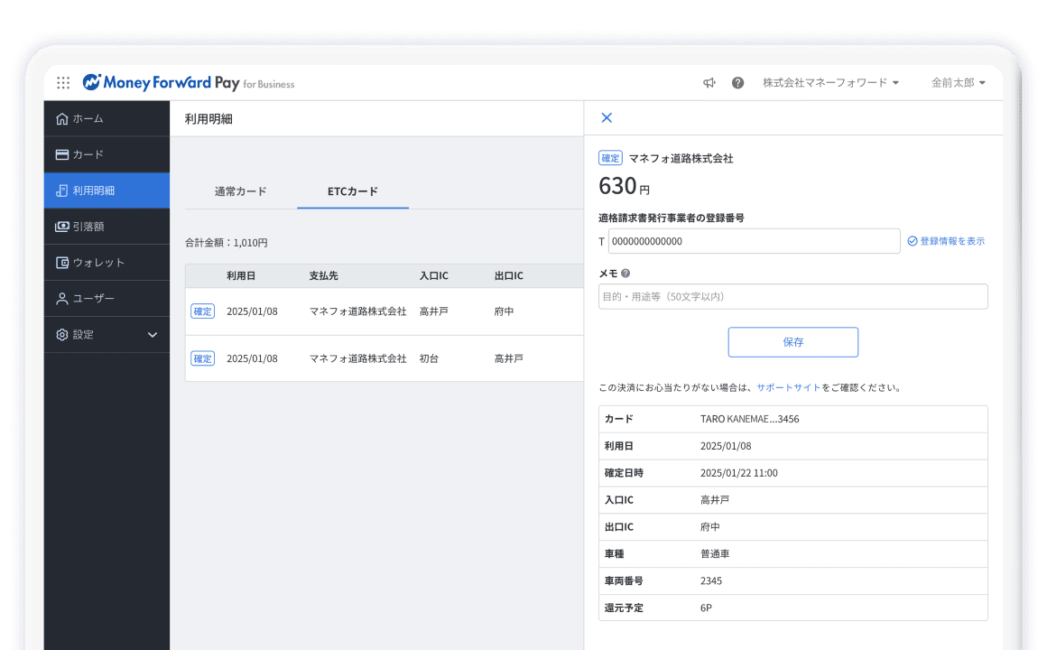 ETCカードごとに明細が確認でき、クラウド会計に連携され経費精算が容易に。また、管理画面で利用したカードや車両番号でのソートが可能です。