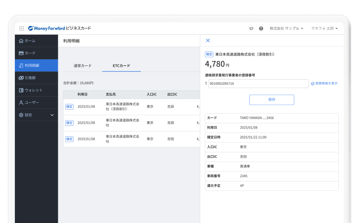 利用明細をカード単位、車両番号でソートして確認可能。利用明細はクラウド会計に連携され、会計処理が容易になります。