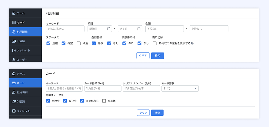 取引明細を「期間」「カード」「支払先」などで検索できるため、必要なデータに絞って閲覧することが可能です。その後の経理処理が楽に行えるように、シンプルな画面表示となっています。