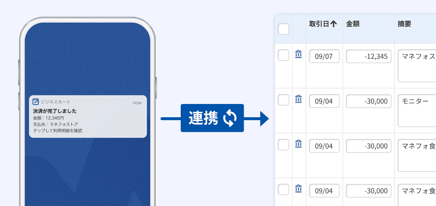 リアルタイムでマネーフォワード クラウド会計の仕訳候補に明細が連携。スマホアプリやWebから領収書などの証憑を添付すると、その画像も自動で連携されます。そのため、データ入力や明細との突合作業などの負担を軽減できます。