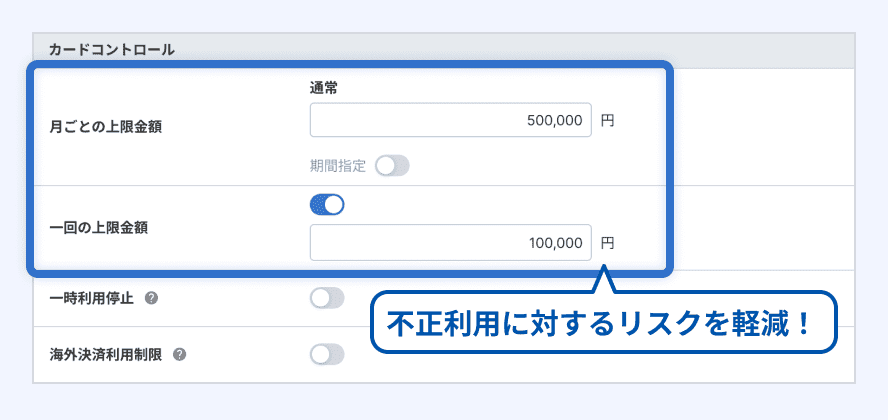 カードごとに「1回の決済上限金額」「1ヶ月の決済上限金額」を設定できるため、必要以上の決済は行えません。これにより、不正利用に対するリスクが軽減されます。