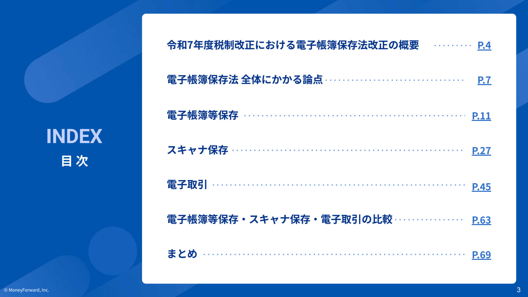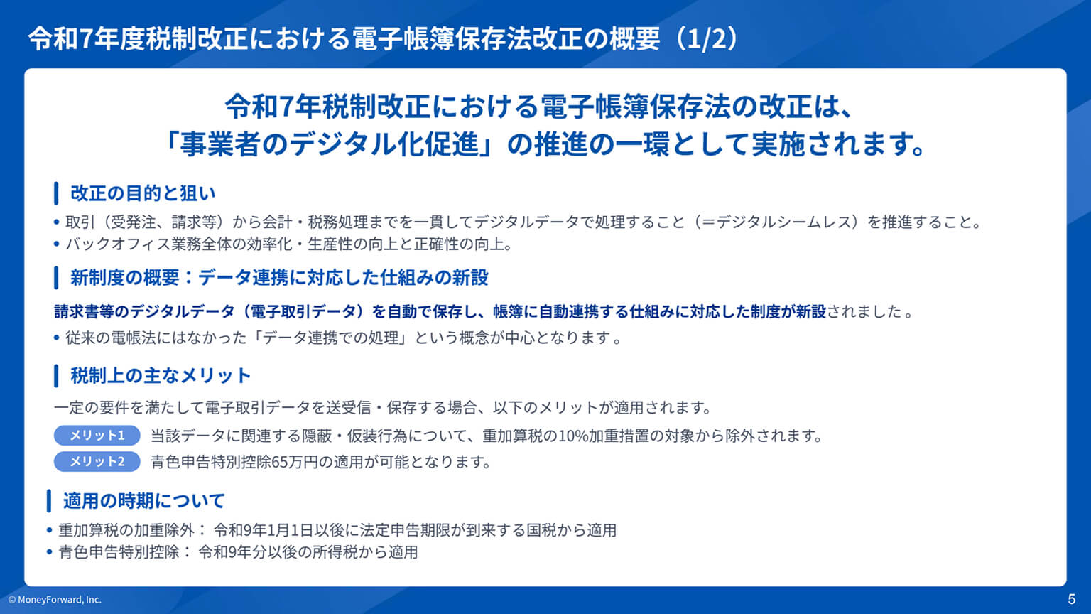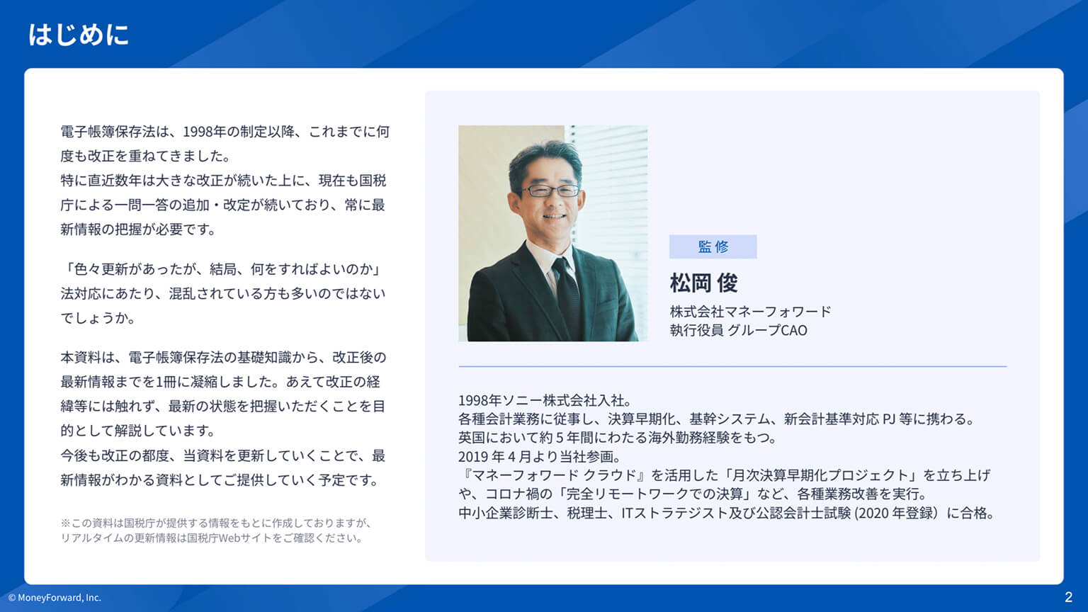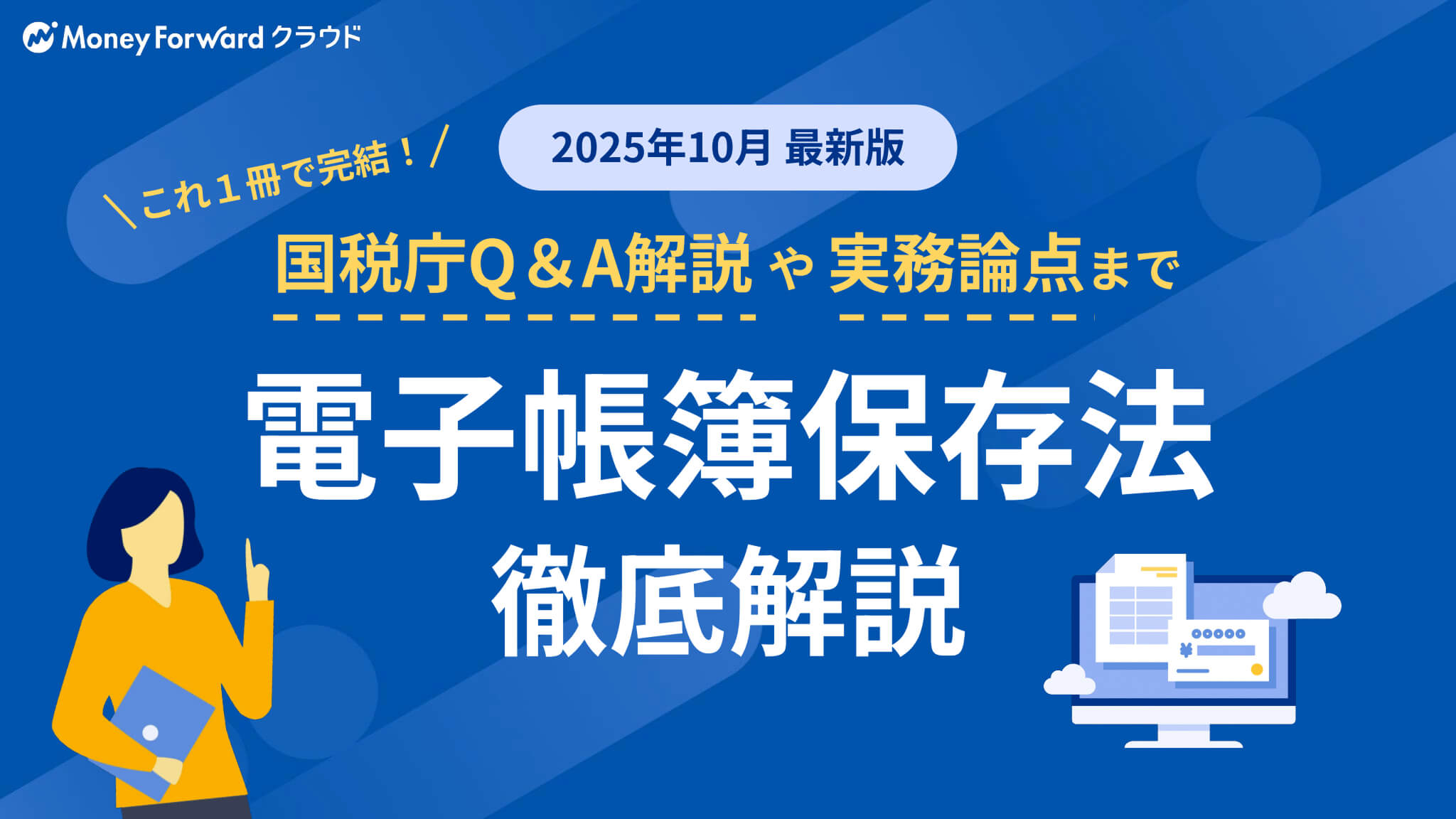 お問い合わせ 電子帳簿保存法に関する資料ダウンロード 資料の下の【資料ダウンロード】をクリックするとフォームが表示されます。 必要事項をご記入の上、ダウンロードページにお進みください。 1分でダウンロード完了 資料ダウンロード 電子帳簿保存法の概要から国税庁Q&A解説、 実務上の論点に至るまで網羅的に整理し、最新解説版として1冊に凝縮 2025年10月 最新版はこちら 資料ダウンロード お役立ち資料 電子帳簿保存法に最低限で対応すると、どうなる? 「取り急ぎ、電子取引データのみ電子保管しよう」と最低限の対応を行うことで様々なデメリットが生じます。電子取引データのみ電子保管する場合のデメリットや、システム導入による業務効率化の方法についてご紹介します。 資料ダウンロード 電帳法 スキャナ保存対応マニュアル 「紙で受け取った証憑のスキャナ保存にはまだ対応していない」という方必見。電帳法の要件を満たしてスキャナ保存に対応する方法・マネーフォワード クラウドを活用した簡単なスキャナ保存対応についてもご紹介します。 資料ダウンロード 電帳法・インボイス制度対応後のバックオフィスの落とし穴 電子帳簿保存法やインボイス制度の概要を簡単におさらいしつつ、制度対応後に陥りがちな落とし穴や各部門の課題、課題の解決方法について解説します。 資料ダウンロード 令和7年度 税制改正大綱 要点まとめ12選 経理担当者の方が最低限知っておきたい「令和7年度 税制改正大綱」の内容について、12選にギュッとまとめて解説。ぜひ情報把握用・学習用・印刷配布用などにご活用ください。 資料ダウンロード 【アーカイブセミナー】電子帳簿保存法の全体像を徹底的に解説 電子帳簿保存法の基礎を徹底解説。基本に立ち返り「電子帳簿保存法の全体像について学びたい」「改めて振り返りたい」「帳簿等保存の要件についても知りたい」等々のお悩みを解決します。 セミナーを視聴する 電子帳簿保存法対応の落とし穴 最近増えている法対応の落とし穴、「電子帳簿保存法に適用される新しい猶予」や「改ざん防止の要件」、「検索要件」、「電子取引ファイルの電子保管」などについて解説します。 資料ダウンロード サービス資料 マネーフォワード クラウド経費 主な内容 マネーフォワード クラウド経費のサービス概要、具体的な特徴と機能 他社サービス比較 料金体系 運用サポートについて 資料ダウンロード マネーフォワード クラウド請求書Plus 主な内容 マネーフォワード クラウド請求Plusのサービス概要と特徴 マネーフォワード クラウド請求Plusの機能 料金体系 資料ダウンロード マネーフォワード クラウド債務支払 主な内容 3つの課題解決 好評を頂いている機能 他社サービス比較 導入事例 料金体系 資料ダウンロード マネーフォワード クラウドインボイス 主な内容 マネーフォワード クラウドインボイス[送付]全体概要 提供価値・強み マネーフォワード クラウドインボイス[送付]機能一覧 資料ダウンロード マネーフォワード クラウド会計Plus 主な内容 マネーフォワード クラウド会計Plusのサービス概要と特徴 マネーフォワード クラウド会計Plusの機能 導入事例 資料ダウンロード マネーフォワード クラウドBox 主な内容 マネーフォワード クラウドBoxの詳しいご紹介 電子帳簿保存法への対応メリット よくあるご質問 資料ダウンロード