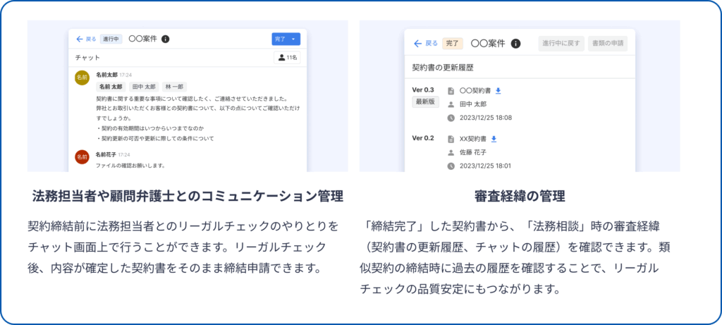 岡本: 私も同様の実感を持っています。申請者と法務担当者が同じ画面上でやり取りできるうえ、法務チーム内だけで情報共有できるクローズドなスペースも用意されている。この二層構造によって、コミュニケーションが整理しやすくなり、運用効率が格段に高まりました。