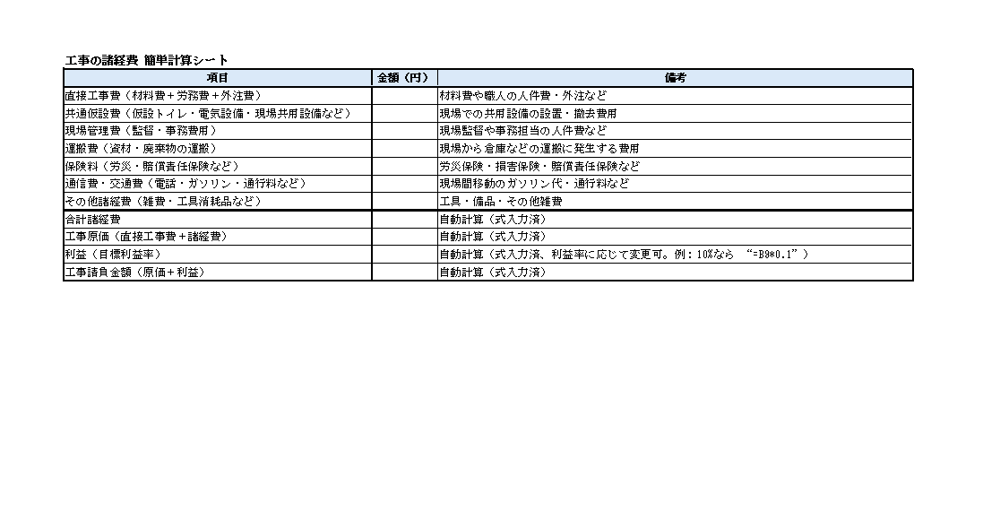 例: 現場管理費:100万円 一般管理費:50万円 利益:30万円 諸経費 = 100万円 + 50万円 + 30万円 = 180万円