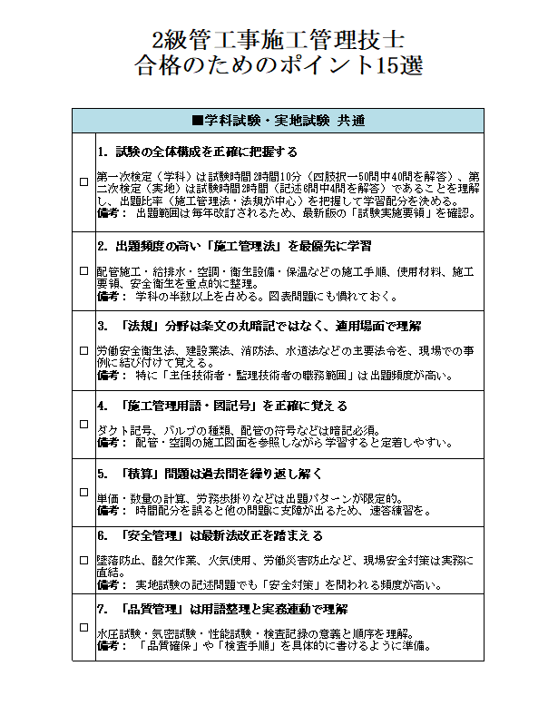 - 1次検定試験:管工事に関する基礎知識や関連法規、安全管理などが出題されます。
