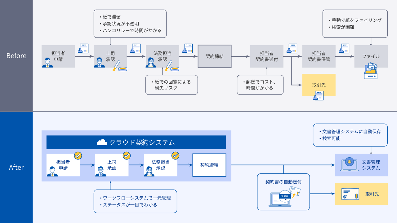 承認から契約締結、保管までの一連のプロセスをデジタル化することこそが、業務効率化の中核です。