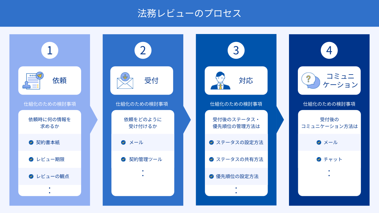 契約審査は一般的に「依頼」「受付」「対応」「コミュニケーション」という4つの工程で進みます。各工程における仕事の進め方を整理して「契約審査依頼フロー」を再定義し、依頼からレビュー完了までのプロセスを見直します。