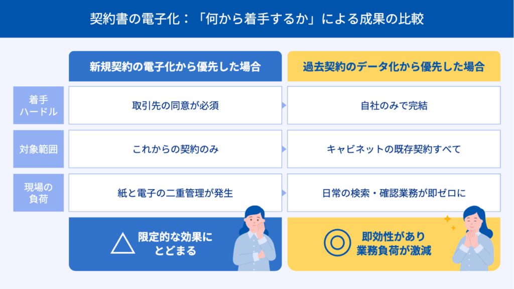 契約業務の改善は、相手の同意が必要な「新規契約の電子化」から急ぐと、思うように進まないことがあります。そのため、まずは自社だけで完結できる「過去の紙のデータ化」から着手するアプローチが有効です。