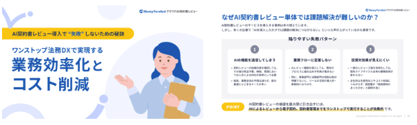 本資料では、AIレビューの価値を最大化する「ワンストップ法務DX」戦略を解説します。弁護士費用の最適化や業務の属人化解消など、法務部門全体の業務効率化とコスト削減を実現する秘訣を、ぜひダウンロードしてご覧ください 。