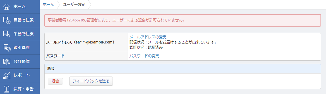 対象のユーザーが自身でサービスを退会できないように制限できます。