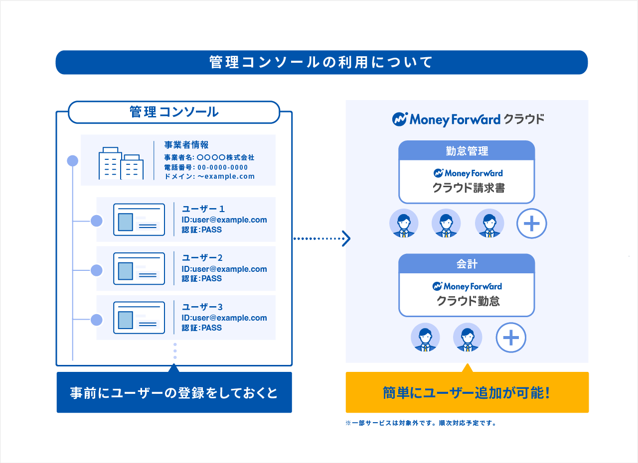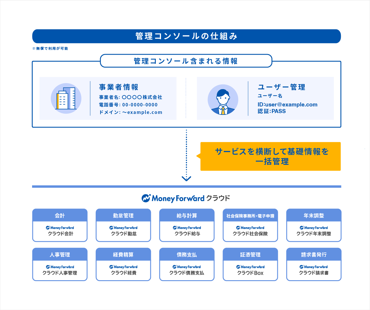 管理コンソールとは、マネーフォワード クラウドで利用する事業者情報とユーザーを管理するマスター画面です。