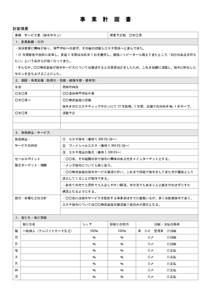 - 資金計画:開業資金(物件取得費、内装工事費、脱毛機購入費、広告宣伝費)と運転資金を算出し、自己資金や融資の計画を立てます。