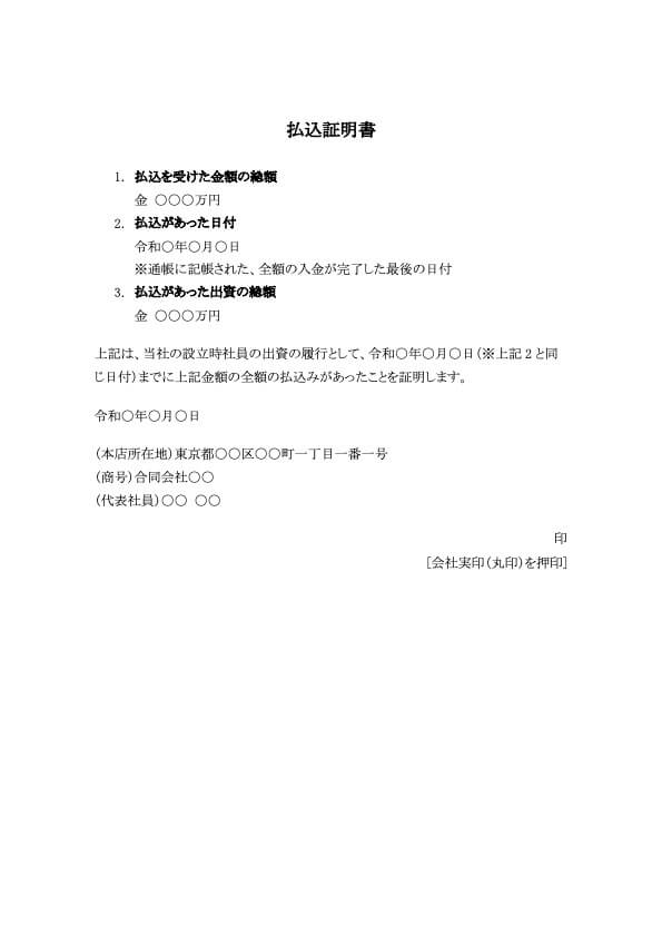 以下のリンクから、合同会社設立時の払込証明書の記載例をダウンロードできます。ご自身の会社情報に書き換えてご使用ください。