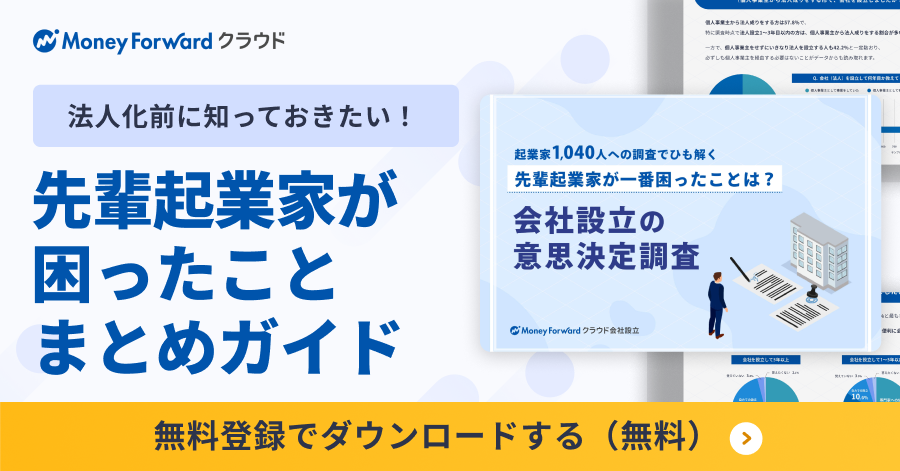 マネーフォワード クラウド会社設立では、会社設立の経験がある方1,040名に対して、会社設立に関する調査を実施しました。先輩起業家が悩んだ部分や、どのように会社設立を行ったかを、定量的に分析したガイドとなっていますので、ぜひご活用ください。