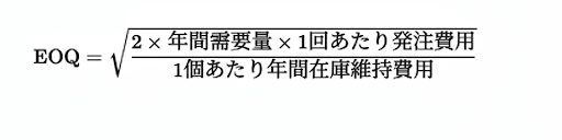 EOQ = ( (2 * 年間需要量 * 1回あたり発注費用) / (1個あたり年間在庫維持費用) ) ^ 0.5