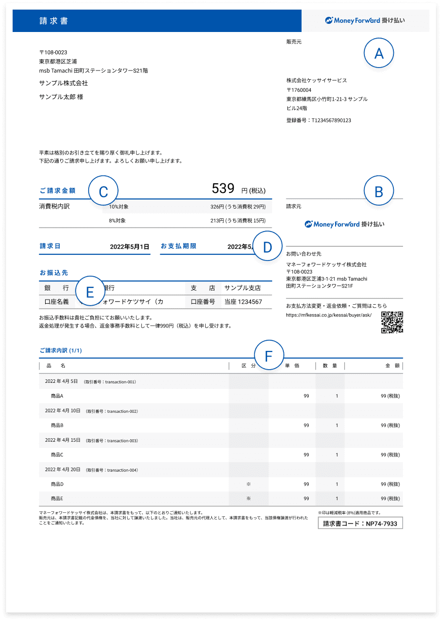 「振替日」までに請求書記載の買い手様(請求書を受け取った方)指定口座より引き落としさせていただきます。引き落とし手数料はマネーフォワードケッサイ株式会社が負担いたします。