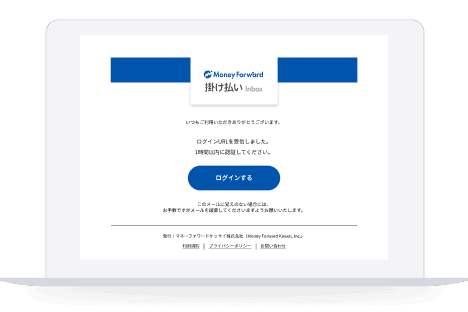 ログイン用URLを受け取るメールボックスに「マネーフォワード 掛け払い インボックス ログインURL発行メール」という件名のメールが届いていることを確認し、そのメールに記載されている「ログイン」をクリックしてください。