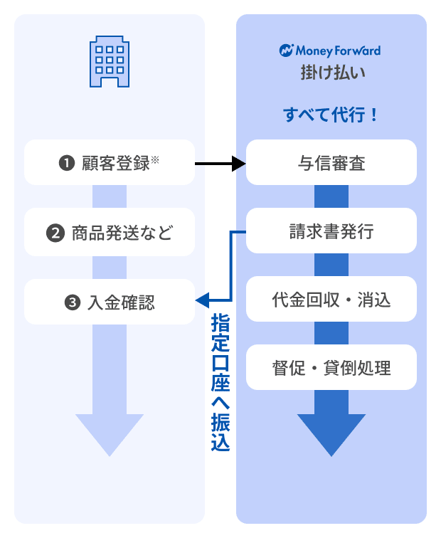 マネーフォワード 掛け払いを導入すれば、与信審査通過取引については100%入金保証(※)。初回購入の顧客に対しても掛け売りが可能になります。※マネーフォワードケッサイ株式会社所定の条件を満たした場合に限ります。