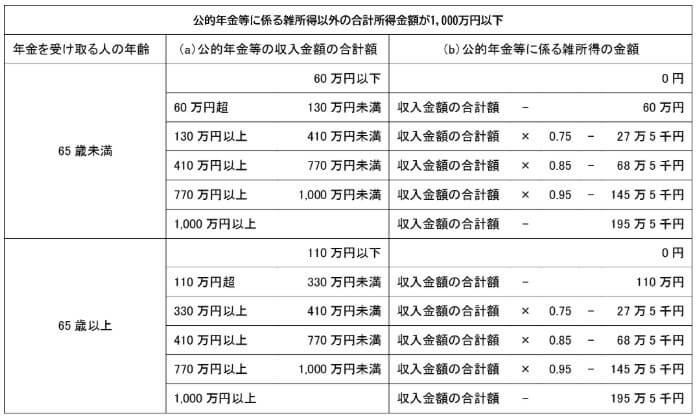 公的年金等の場合、65歳に満たない方は、年金による収入額が60万円以下の場合、全額控除の対象となり結果的に雑所得の金額は0円となります。ただし、合計所得金額によって公的年金控除額は異なります。