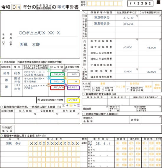 年金収入(雑所得)と給与所得がある場合には、「給与所得者(年末調整済)の記載例」を参考にするのがよいでしょう。記載が必要な用紙には「第一表」と「第二表」の2種類があります。