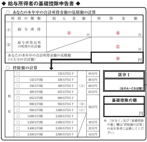 基礎控除の額を求めるには、上記のⒶからⒹを記入します。