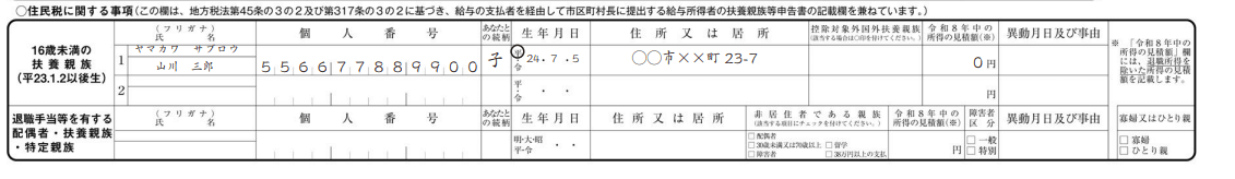 赤枠部分に自分の名前などを記入したうえで、青枠に扶養している16歳以上の子の名前、生年月日、住所、続柄、マイナンバーなどを記入します。