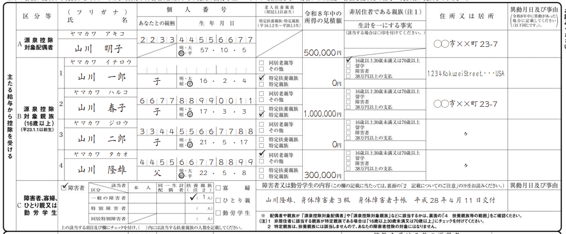 引用:A2-1 給与所得者の扶養控除等の(異動)申告|国税庁、「《記載例》令和8年分給与所得者の扶養控除等申告書」
