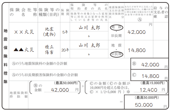 旧長期損害保険料とは、2006年12月31日までに締結した契約で一定の要件を満たした損害保険が該当します。保険料控除証明書にも旧長期損害保険料の場合はその旨記載がありますので、保険料の区分の欄には「旧長期」に〇をします。地震保険料と計算方法が異なることに注意が必要です。