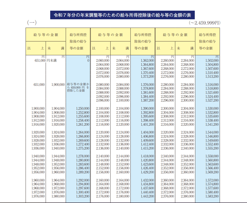 引用:令和7年分 年末調整のしかた|国税庁、「令和7年分の年末調整等のための給与所得控除後の給与等の金額の表」