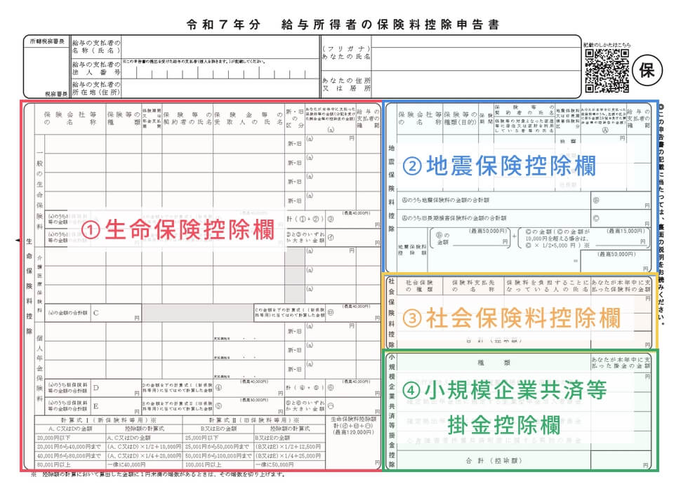 申告書には、「独立行政法人中小企業基盤整備機構の共済契約の掛金」「確定拠出年金法で定められた企業型年金加入者掛金」「確定拠出年金法で定められた個人型年金加入者掛金」「心身障害者扶養共済制度で一定の要件に該当する契約の掛金」の4種類について記載します。