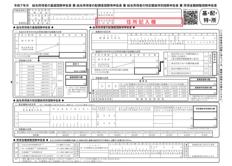 出典:令和7年分給与所得者の基礎控除申告書兼給与所得者の配偶者控除等申告書兼給与所得者の特定親族特別控除申告書兼所得金額調整控除申告書(PDF/1,235KB)
