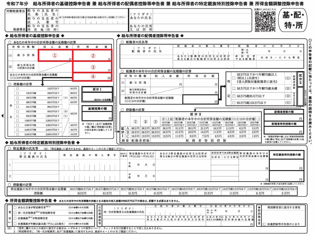 出典:A2-4 給与所得者の基礎控除、配偶者(特別)控除、特定親族特別控除及び所得金額調整控除の申告|国税庁、「令和7年分 給与所得者の基礎控除申告書 兼 給与所得者の配偶者控除申告書 兼 給与所得者の特定親族特別控除申告書 兼 所得金額調整控除申告書」を加工して作成