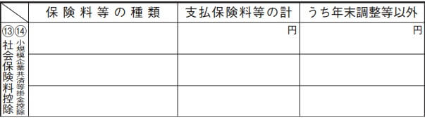 次に、第二表の「⑬社会保険料控除」と同じ欄にある「⑭小規模企業共済等掛金控除」にも、掛け金の額を記入します。今回は年末調整に間に合わなかったケースを想定しているため、「支払保険料等の計」「うち年末調整等以外」の両方に同じ金額を記入しましょう。