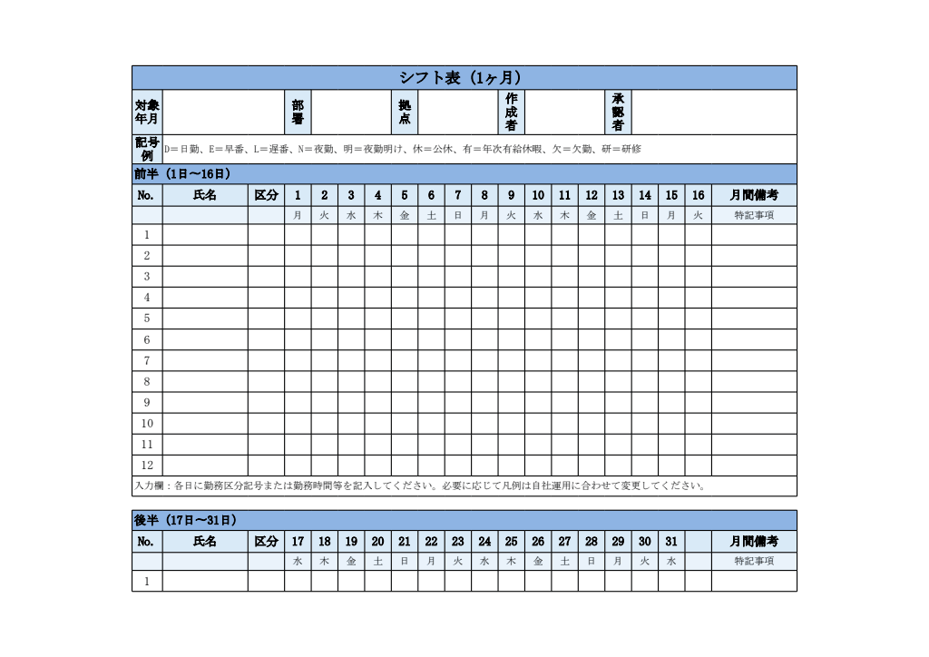 毎週のシフトがだいたい決まっている職場などにはとても有効なシフト管理表でしょう。