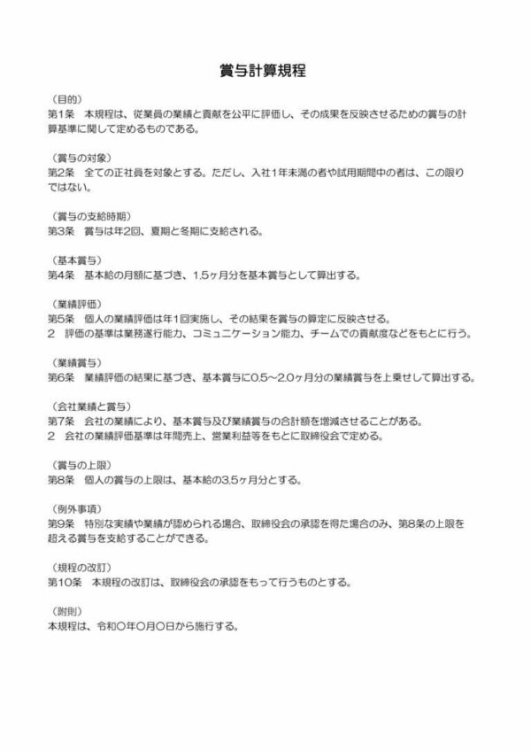 賞与計算に関する取り決めを整備するための、エクセル形式の規程テンプレートです。貴社の規定や運用に合わせて手軽に内容を修正・カスタマイズいただけます。